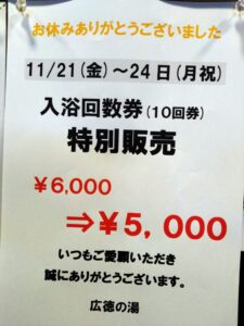 2日間のお休みに、目に見える部分として、内湯の板張りを張り替えました。また、お休みいただきました御礼として「入浴回数券」を24日(月)までお得に販売いたします。ご来館お待ちしております。