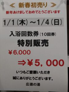 広徳の湯では、新春をお祝いし、本日1月1日(木)~1月4日(日)までの4日間「入浴回数券」をお得に販売いたします。ご家族が増えるお正月です、皆さんご一緒にお越しください。
